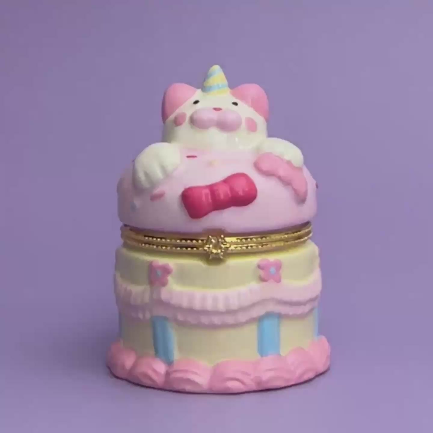 This miniature keepsake features pastel icing details, tiny sprinkles, ribbon accents, and a cheerful bear wearing a party hat. The gold-hinged lid opens to reveal a small compartment ideal for storing rings, earrings, notes, or tiny treasures. Each piece is individually painted, giving every box its own unique charm — no two are exactly alike.