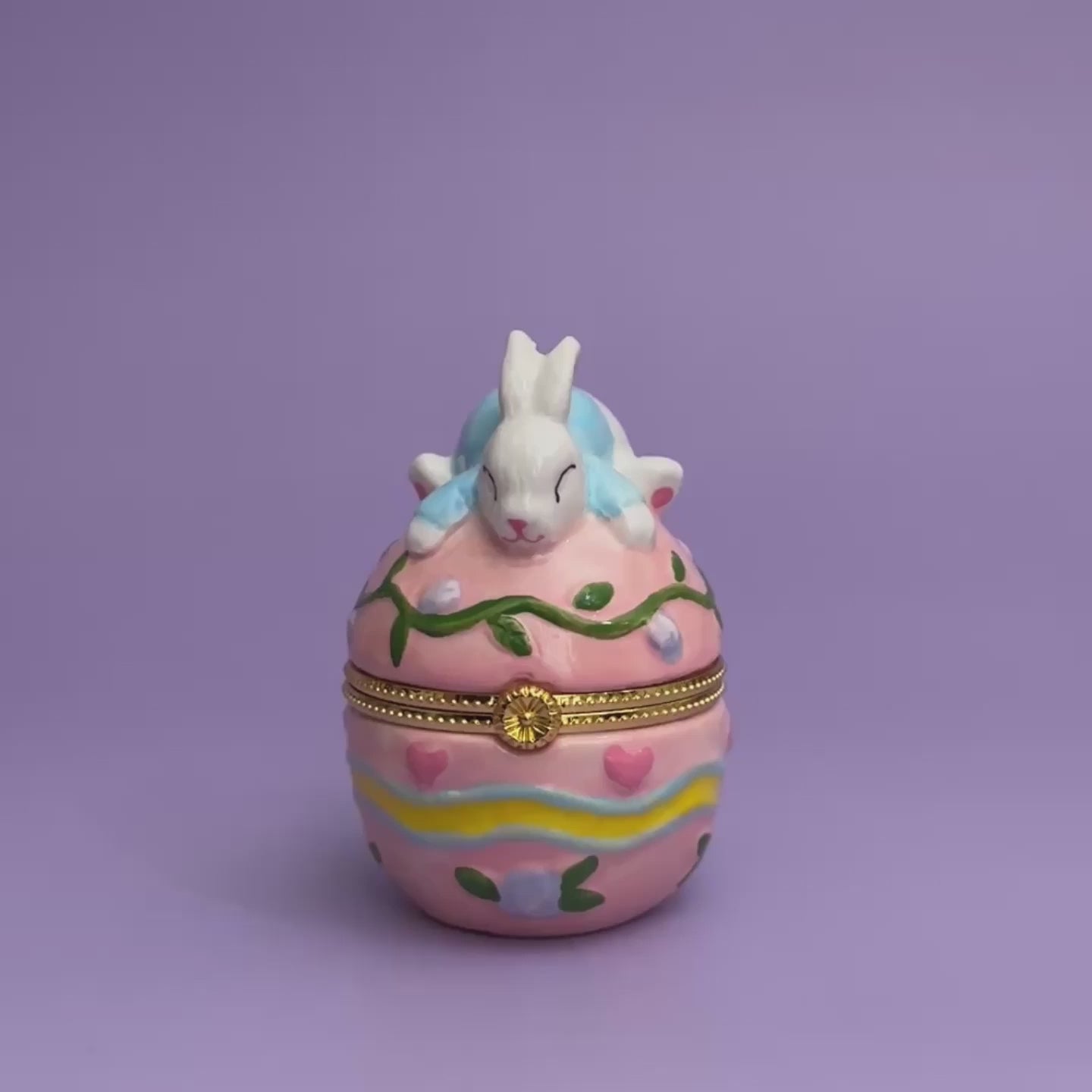 Welcome spring with this enchanting ceramic Easter egg trinket box! Adorned with delicate flowers and topped with a sweet white bunny, it's perfect for storing small treasures and adding cheerful decor.