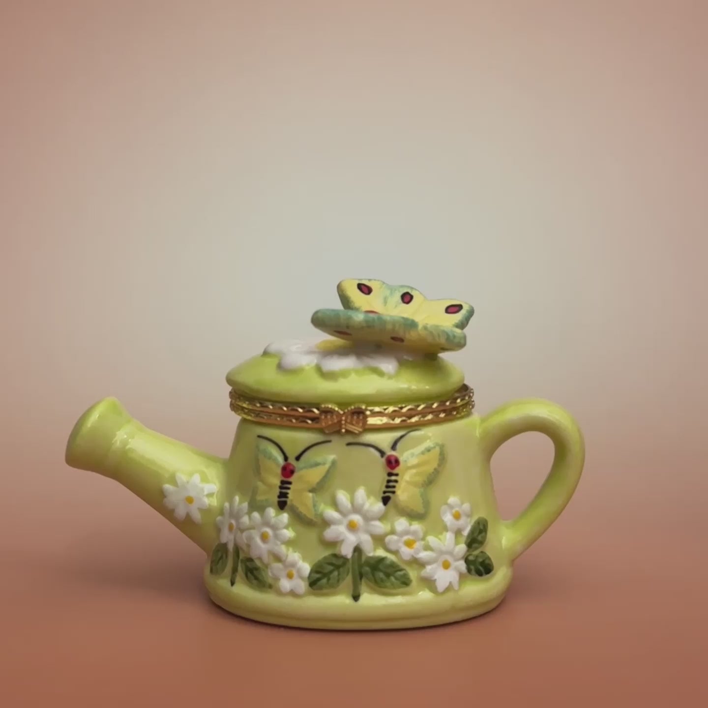Bring spring garden beauty indoors with this delightful ceramic Watering Can Trinket Box! Adorned with butterflies and daisies, its top opens to reveal a secret compartment for tiny treasures.