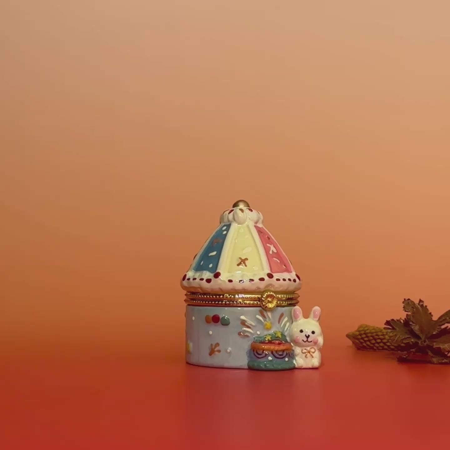 A hand-painted ceramic trinket box inspired by a whimsical carousel tent — perfect for collectors, gift lovers, and anyone who adores nostalgic charm.