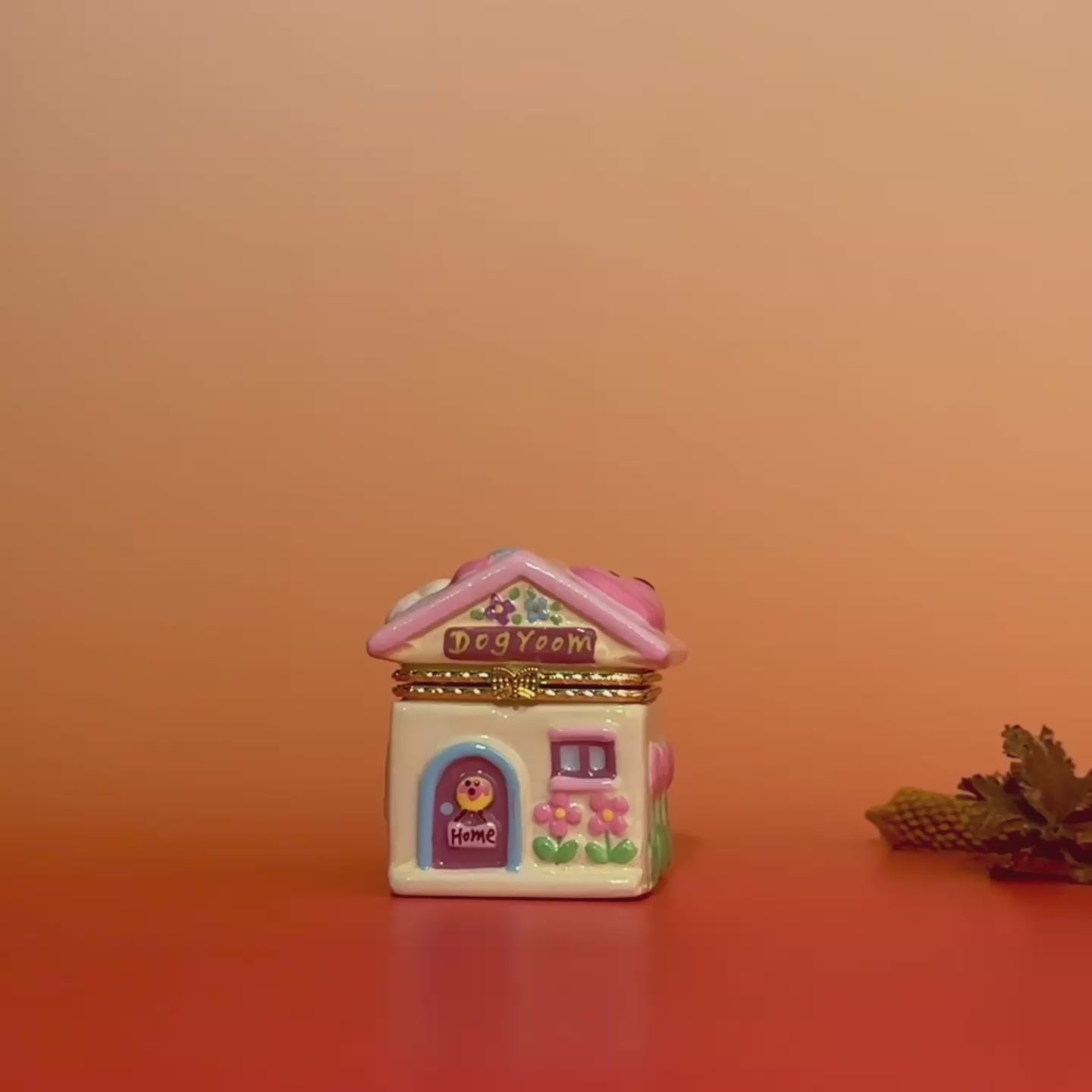 A hand-painted ceramic trinket box shaped like a charming little dog house — perfect for collectors, décor lovers, and anyone who enjoys sweet, nostalgic details.